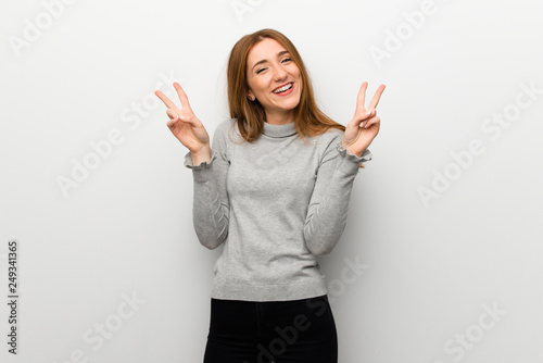 Redhead girl over white wall smiling and showing victory sign with both hands