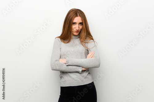 Redhead girl over white wall with sad and depressed expression