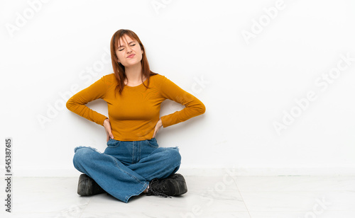 Redhead girl sitting on the floor isolated on white background suffering from backache for having made an effort