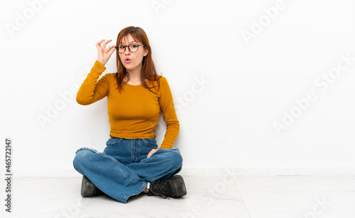 Redhead girl sitting on the floor isolated on white background with glasses and surprised