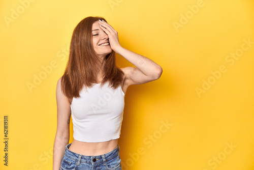 Redhead in white tank top, relaxed studio pose laughing happy, carefree, natural emotion.