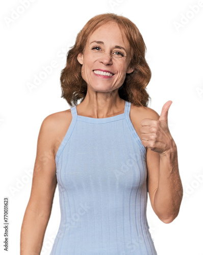 Redhead mid-aged Caucasian woman in studio smiling and raising thumb up
