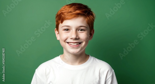 redhead teen boy green background wearing plain white tshirt smiling happy portrait