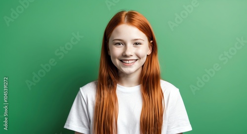 redhead teen girl green background wearing plain white tshirt smiling happy portrait