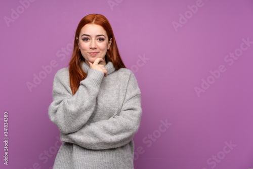 Redhead teenager girl over isolated purple background laughing