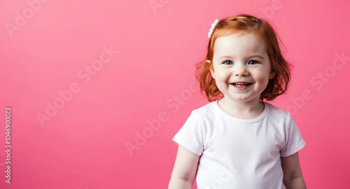 redhead toddler girl pink background wearing plain white tshirt smiling happy portrait