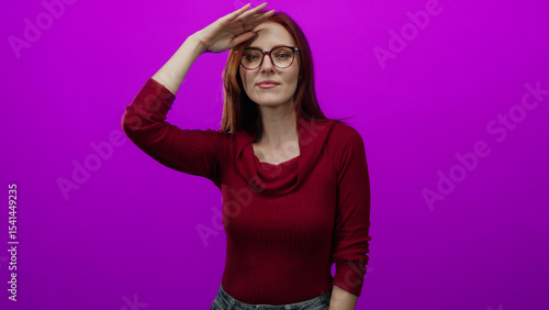 Redhead woman gazing into the distance against an isolated vivid pink background, wearing glasses and a red sweater, embodying beauty and allure with a thoughtful expression.