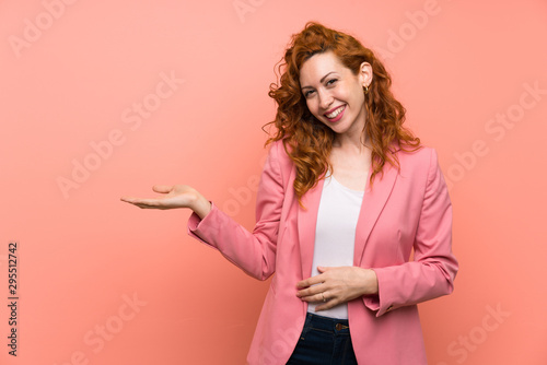 Redhead woman in suit over isolated pink wall holding copyspace imaginary on the palm