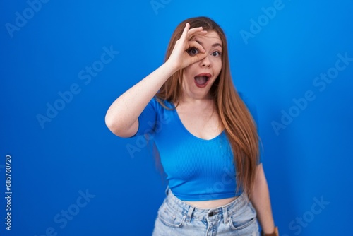 Redhead woman standing over blue background doing ok gesture shocked with surprised face, eye looking through fingers. unbelieving expression.