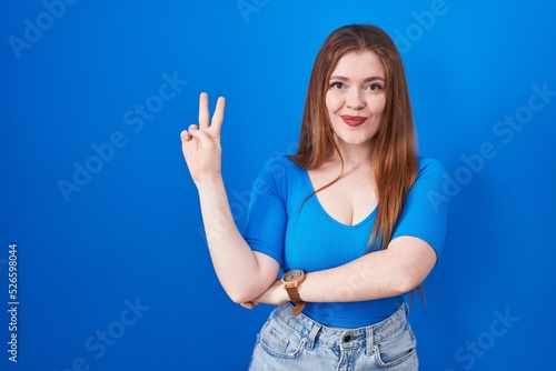 Redhead woman standing over blue background smiling with happy face winking at the camera doing victory sign with fingers. number two.