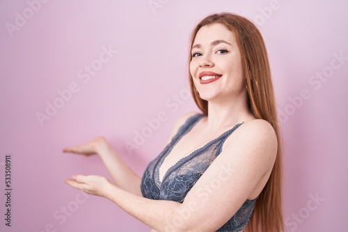 Redhead woman wearing lingerie over pink background inviting to enter smiling natural with open hand