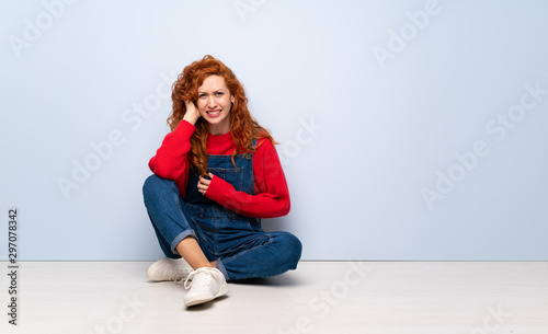 Redhead woman with overalls sitting on the floor having doubts