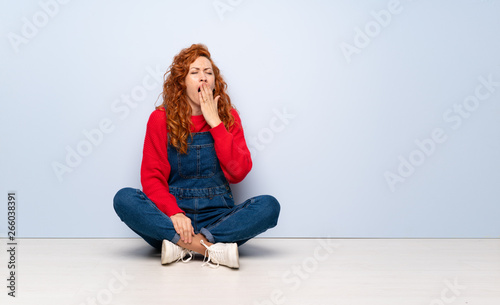 Redhead woman with overalls sitting on the floor yawning and covering wide open mouth with hand