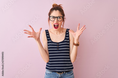 Redhead woman with pigtail wearing striped t-shirt standing over isolated pink background crazy and mad shouting and yelling with aggressive expression and arms raised. Frustration concept.