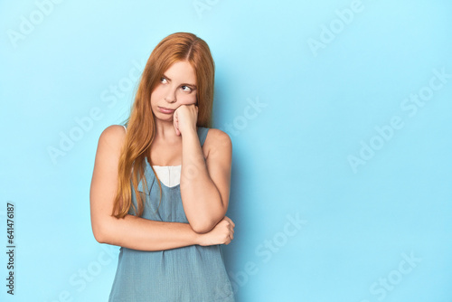 Redhead young woman on blue background who feels sad and pensive, looking at copy space.