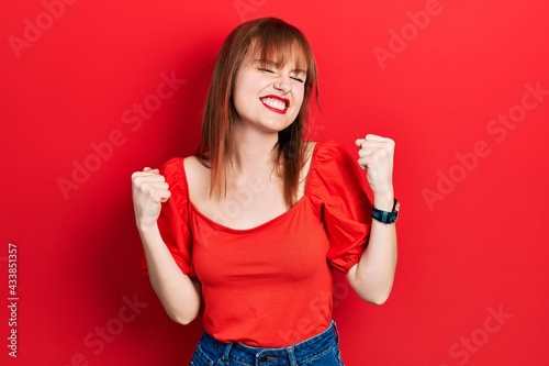 Redhead young woman wearing casual red t shirt very happy and excited doing winner gesture with arms raised, smiling and screaming for success. celebration concept.