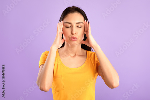 Reducing Stress. Young woman massaging temples with closed eyes, breathing out, trying to calm down, purple studio wall