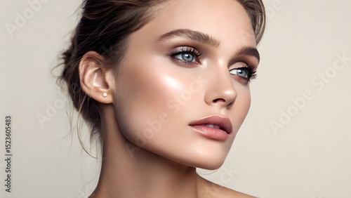 Refined close-up of a female face featuring digital makeup overlays, illuminated by soft lighting and surrounded by neutral tones, exemplifying minimalist beauty trends.
