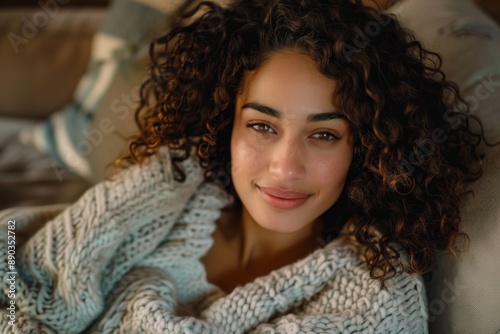 Relaxed woman with curly hair wearing cozy sweater, lounging on a soft couch. The warm lighting enhances the cozy feel of the image. Ideal for lifestyle, comfort, or relaxation themes. Generative AI