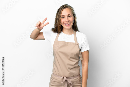 Restaurant waiter caucasian woman isolated on white background smiling and showing victory sign