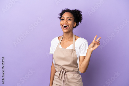 Restaurant waiter latin woman isolated on purple background smiling and showing victory sign