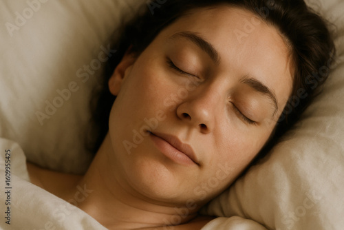Restful Slumber: A peaceful woman sleeps soundly, shrouded in the embrace of a soft, comforting bed. Experience the tranquility of restful slumber and inner peace.