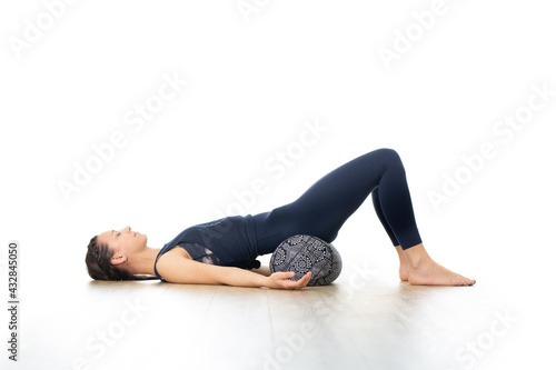 Restorative yoga with a bolster. Young sporty attractive woman in bright white yoga studio, lying on bolster cushion, stretching and relaxing during restorative yoga. Healthy active lifestyle