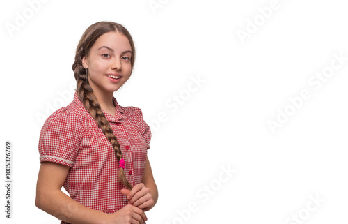 Retro style. Stylish girl has braided hair. Teen fashion style. Style for girl. Beauty and retro fashion. Portrait of retro teen girl isolated on white. Teen girl looking at camera. Advertisement