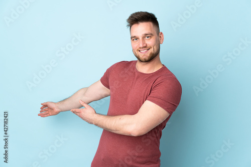 Russian handsome man over isolated background extending hands to the side for inviting to come