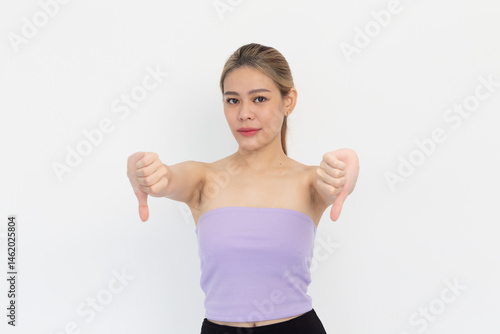 Sad angry disappointed young woman showing thumb down dislike at camera on a white background