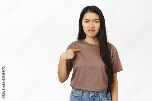 Sad asian woman pointing at herself, sulking and grimacing upset, being unconfident, standing over white background