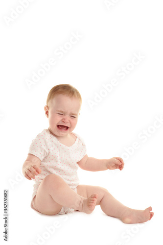 Sad baby girl sitting and crying isolated on white background