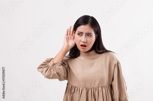 sad frustrated unhappy woman listening ear to bad news or having hearing impair, hard of hearing