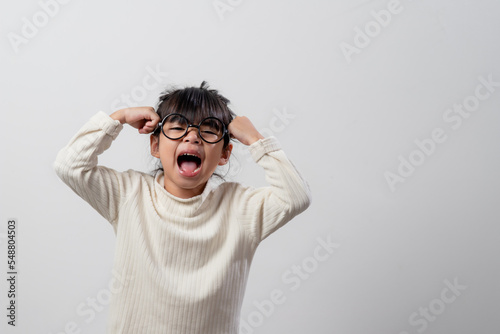Sad little girl holds his head. little girl feeling sick, having headache.
