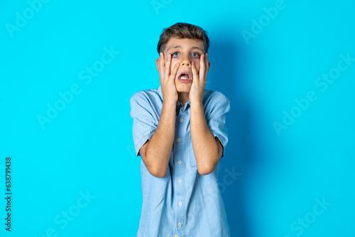 Sad lonely Beautiful kid boy wearing casual blue shirt touches cheek with hand bites lower lip and gazes with displeasure. Bad emotions