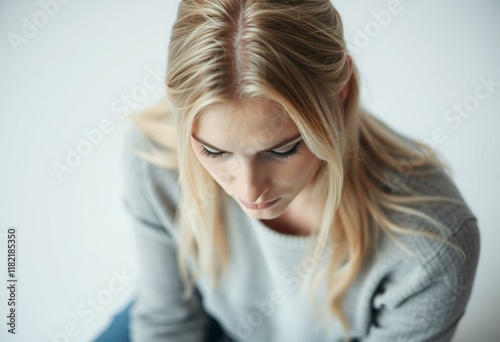Sad Nordic blonde woman looking down