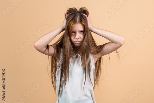 sad teen girl touch hair. upset child having headache. migraine. unhappy kid feeling stressed and overworked. going crazy. hairdresser concept. healthy and strong hair. transitional litigious age