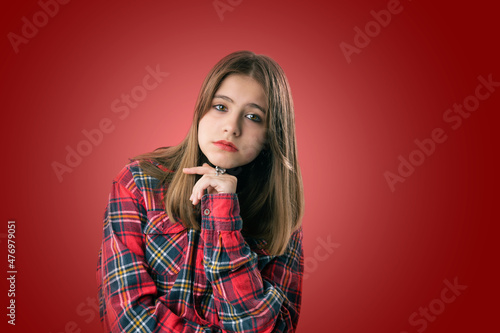 Sad teenage girl on red background. Portrait of sad unhappy teenage girl. Studio shot. Isolated on red background. .