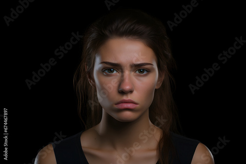 Sad young adult Caucasian woman on black background. Neural network generated image. Not based on any actual person or scene.