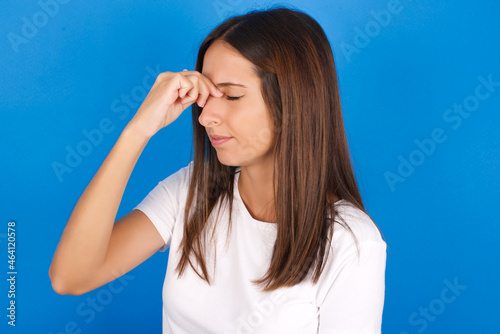 Sad young european girl wearing white t-shirt on white background suffering from headache holding hand on her face