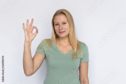 Satisfied woman showing ok sign. Young female model making ok gesture. Portrait, studio shot, quality, support concept