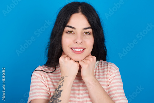 Satisfied young beautiful tattooed girl wearing pink striped t-shirt standing against blue background touches chin with both hands, smiles pleasantly, rejoices good day with lover