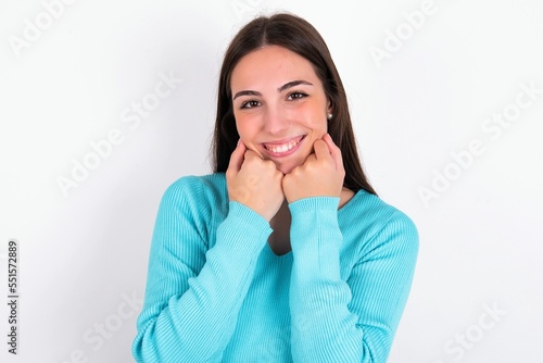 Satisfied Young caucasian woman wearing blue sweater over white background touches chin with both hands, smiles pleasantly, rejoices good day with lover