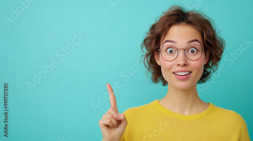 Scandinavian woman pointing up, idea expression pose, advertisement pose, blue background.