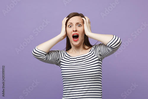 Scared shocked young woman girl in casual striped clothes posing isolated on violet purple background studio portrait. People lifestyle concept. Mock up copy space. Screaming, putting hands on head.