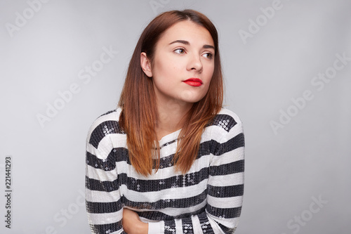 Scared woman notices something terrifying aside. Exhausted female trembles and feels cold, hugs herself to warm up, clatter with teeth after walk during frosty weather, isolated over grey background.