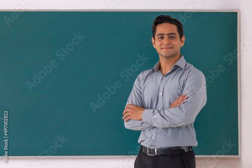 School teacher standing in front of blackboard with arms folded in classroom