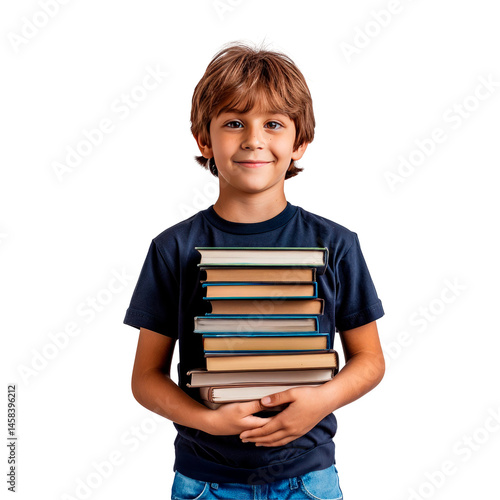 Schoolboy boy in blue t-shirt and jeans holding stack of books isolated on transparent pnn background. Education, learning, school concept