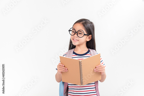 schoolgirl hugging book wearing backpack smiling isolated on white background