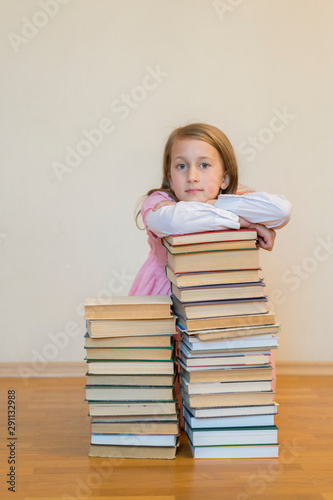 Schoolgirl huging books. Education concept. back to school. copy space. vertical photo